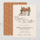 Anpassad boho ökenbröllop klara datum klara inbjudan med en modern ökenlandskapsillustration med solnedgång och kaktus, modern skrifttyp för Klara datum och helt anpassningsbar textmall för parets namn och bröllopsinformationen. Söt matchande ökenmönster på baksidan på en varm brun terrakotta bakgrund.