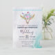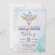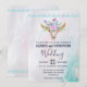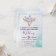 En bröllopsinbjudan med turkos och pastelljus akvarellbakgrund. En bohemisk djurskalle med en bukett blommor på huvudet och små fjärilar som fladdrar omkring. En söt dekorativ kant med små tåreformade figurer i ljusblått.