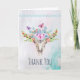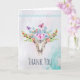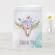 Tackkort med turkos och pastell vattenfärg bakgrund. En bohemisk djur-dödskalle med en blomsterbukett på huvudet och små fjärilar som fladdrar runt.