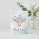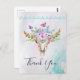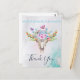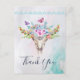 Tack-kort med ett personligt meddelande på baksidan. Designat med en turkos och pastellakvattenfärgsbakgrund. En bohemisk djur-dödskalle med en blomsterbukett på huvudet och små fjärilar som fladdrar omkring. En söt dekorativ kant med små tåreformade former i ljusblått.