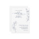 This wedding invitation features a clean white background with navy blue text and artwork. Fine eucalyptus springs in simple line art add a soft and natural botanical touch. The design has a modern and elegant look with a fresh, minimal layout. It fits well with classic navy blue wedding themes and greenery accents.