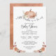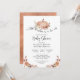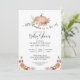 Vackra, varma, vattenfärgade blommor med neutralt grönt, sienna och brunt löv. "BOHO Fall Pumpkin Blommigt Autumn Löv Pampas Grass Flicka Shower bjudning." Trendigets jordtonspalett färg med persikor, koppar, terracotta, bärnstensfärgad, sienna och muterad sage grey med elfenben och persikoblommor. All teckning har målats och grafiskt designat av den internationellt licensierade konstnären och designern Audrey Jeanne Roberts. Upphovsrätt.