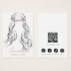 This jewellery display card presents a boho-inspired illustration with long, wavy hair in black and white, accented by colorful pastel flowers in her hair, blending simplicity with a touch of bohemian elegance. It includes precise spots for displaying earrings on her ears. Customizable features such as your name, website, slogan, and social media icons, alongside a QR code, are available for a tailored brand experience. The card's boho-chic design, paired with its sleek layout, makes it perfectly suited for a handmade jewellery brand.