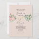 Elegant, modern, boho, floral rosa dammros vigselinbjudan med guldrep hjärta, akvarellblommor, grönska och enkel kalligrafi skrift.