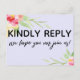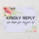 Både baksidan och framsidan accentuerades med söt, färgstarka vattenfärgblommor. I redigerbar text placerades "vänligt svar", stort och fet, på framsidan. I en modern handskrift av avslappnader visas nedan en bild som visar "vi hoppas att du kan gå med oss!". På baksidan användes samma unika teckensnitt för att skapa bilder som "osa", "m", "leverera till:" och "menyval för varje gäst:" All annan text är redigerbar. Använda mallen fält att anpassa så mycket du vill. Bakgrunden kan ändras till vilken färg som helst som du kostym. 100 //