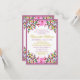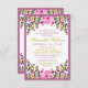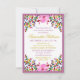 Boho Foliage Hibiscus Baby Shower-inbjudan. Vitaktig с oljig gren med lila, blått, rosa, gyllene, grönt löv och rosa hibiscus blommor. Golden och lila text. Lila gräns.