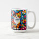 A cute cat themed coffee mug. A cute colorful boho cat sitting in flowers and surrounded by butterflies. The art is in an impasto oil paper quilling style.