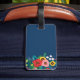 Monogrammed bagagemärkre i djupblå med din monogram i mörk - blått och vit ovanför en blom- ordning av ro, pansies och daisy i olikt skuggar av rosor och gult.