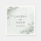 Elegant boho wedding napkins feature romantic eucalyptus in a delicate shade of sage green and simple, stylish dark green typography script on a watercolour background, complemented by rustic sage green eucalyptus leaves. Customise with your unique details..
