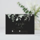 Boho Greenery Black Eucalyptus Bröllop OSA Card. Tryck elegant på dina gäster i bröllop med detta elegant designade bröllop OSA-kort med vacker grönt eukalyptus löv på en häpnadsväckande svart bakgrund. Detta bröllop OSA-kort har en vacker grönt-foliedesign, med rustiska och botaniska vibes, perfekt för din rustiska, gröna eller eukalyptus-stil bröllop. Den minimala och moderna layouten uppmärksammar den lush-grönten, elegant eucalyptus löv-arrangemangen, som sätts på en svart minimalistisk bakgrund med ett känsligt mörk grönt typsnitt. Med det här bröllop OSA-kortet får du tonen för ett vackert bröllop-läge omgivet av antingen silver grönt, svart eller sage grönt bröllop dekoration. Ett perfekt som tillägg till ett botaniskt eller rostfritt firande.