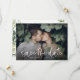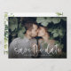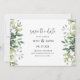Chic moderna bröllop spara datum-kort med en dubbelsidig design med foton och text. På framsidan lägger du till ett utfallsfoto med ett minimalistiskt textöverlägg och ett handskriftsteckensnitt. På baksidan finns det utrymme för alla ytterligare detaljer om bröllop som omges av ett söt botaniskt ram av boho water grey löv och grenar. Använda verktyg för att redigera typsnitt och färg eller lägga till fler foton för att utforma ett unikt Spara datum meddelande för bröllop.