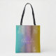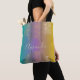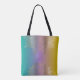 Sprid positivitet vart du än går med denna fantastiska, andliga design. Konsten visar ett invecklat guldfiligran-mandalamönster - som påminner om en blommande lotus - elegant tudelat i över- och underkant. Denna metalliska linjekonst sitter på en drömlik pastellregnbågsfärgad bakgrund som tonar sig sömlöst från sval turkos och teal, genom mjuk lavendel-lila, till ett varmt senapsgult. Vattenfärgseffekten ger väskan ett modernt, konstnärligt djup.