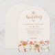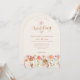 Denna terrakotta höstbröllopsinbjudan med vildblomsvalv förenar på ett vackert sätt höstlig charm med elegant sofistikation. Med handmålade akvarellvildblommor runt en graciös båge frammanar de rika färgerna bränt orange, terrakotta, lila, gul, korall, bränd umbra, persika och mjuk rosa höstens värme. Den eleganta skriften och den moderna typografin tillför en touch av klass medan de lekfulla blommorna ger en personlig, bohemisk touch. Lättanvända mallar för att lägga till alla viktiga detaljer om bröllopet. Designad med originalkonst av konstnären Catherine Sweetman, erbjuder denna inbjudan en perfekt balans mellan naturens skönhet och raffinerad elegans, vilket skapar en varm och inbjud