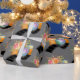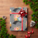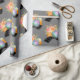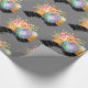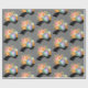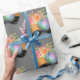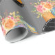 Inpackningspapper med en vattenfärgsillustration av en orange kamera med en blomsterbukett och en svart-vit vågig filmremsa.