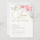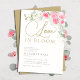En elegant och modern "Kärlek är i Bloom" inbjudningskort för möhippan med en lush bouquet av ro, orkidéer, eukalyptus och något annat guld-löv (inte äkta guld, detta är en digital effekt), liksom modern kalligrafi.