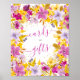Följ gästerna med stil med hjälp av den här boho-moderna handmålade blommigten "Kort och gåvor". De livliga nyheterna lila, grönt, lavender och gult skapar en inbjudande atmosfär för firande. Blommigtar med flytande vattenfärger ger en aning naturinspirerad charm, medan glatt faux guld glitter ger tillfälle en inslag av sofistikering. Det moderna typsnittet för skript i eleganten säkerställer ett sammanhängande och snyggt utseende som förbättrar den övergripande estetiken i din bohemininspirerade händelse. Detta originalillustrerade tecken riktar elegant gästerna till det utsedda området för kort och gåvor, skapar det både praktiskt och visuellt tilltalande.