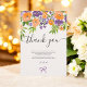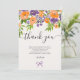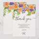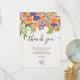 Detta handmålade tackkort för bröllopsdusch har livfulla lila och orangefärgade akvarellblommor och vilda blommor med en kokett lila slinga i en bohoinspirerad design. Perfekt för att uttrycka hjärtlig tacksamhet, ger det en elegant och personlig touch till din vår- eller sommarfirande.