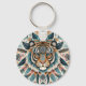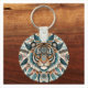 Vacker boho stil mandala med tiger och fjädrar i rosafärgad, turkos och jordnära toner.