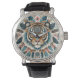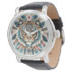 Vacker boho stil mandala med tiger och fjädrar i rosafärgad, turkos och jordnära toner.