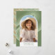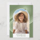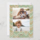Ett modernt God jul-fotokort i skuggor av pastel guld och grönt. Curvy retro linjer omger fotot med pastellskuggor. Fotot på framsidan är en mod med ett vitt gräns. Baksidan innehåller ytterligare två foton. Bakgrunden till ryggen är en boho färgad herringbone mönster - en eclectisk blandning av mönster.