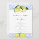En boho, modern och trendig möhippa-te-duschinbjudan med gult citroner, hand plockade i vattenfärg och färg pennor över en vattenfärg mönster av blå plattor som inspirerats av Medelhavstraditionerna. Anpassa den till namn, datum, tidpunkt och alla detaljer. Modern kalligrafi för namn och ram i guld för bakgrunden.