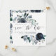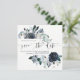Det här trendiget och elegant bröllop sparar datumkortet med blommor med blå vattenfärg med lush löv, bär och fjädrar. På inbjudningens framsida finns snyggt av modern kalligrafi tillsammans med datum och information för namn och bröllop. Baksidan omges av en blommigt ram.
