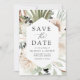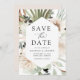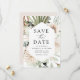 Elegant, tropisk blommigt bröllop spara datum med ett geometriskt ram av tropiska blommor, handflatan löv, pampasgräs och grönt bladverk. Anpassa det botaniska spara datumet med namn, bröllop-datum, plats osv. Boho-blommigten sparar datumet perfekt att meddela ditt kommande sommarbröllop.