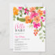hej Baby! En orange för boho-chic, rosa och grönt blommigt vattenfärg för könsneutral babyduschfest med söt handmålade blommor i och blommar med grönt lövverk. med en modern teckenpensel.