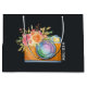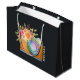 En stor presentväska i personligen med en vattenfärgad illustration av en orange kamera och en blommigt bukett som vilar på ovansidan. Blommorna i buketten är ljusa rosa och orange med grönt löv, en söt blommigt arrangemang.