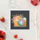 En papper napkin med en vattenfärgad illustration av en orange kamera och en blommigt bukett som vilar ovanpå. Blommorna i buketten är ljusa rosa och orange med grönt löv, en söt blommigt arrangemang.