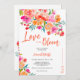Boho orange kärlek är i blommande blommigt inbjudningskort för möhippan, med söt handmålad orange, rosa och gula blommor vattenfärgad illustration med ett modernt elegant med skript som säger att Kärlek är i blomning, med bohemisk grönt löv. Perfekt för Sping, sommartid utomhus möhippa eller bröllopsfest.