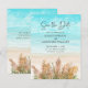 Kommer du att hålla din bröllpsceremoni i söder eller kanske på stranden? Vårt färgglada "Spara datum"-kort hjälper dig att föreställa dig scenen med ett bohemiskt blomsterarrangemang av pampasgräs i nyanser av guld, roséguld och grönt på en sandig strand. Textillustrationen "Spara datum" visas i ett elegant skrivstil och all annan text på framsidan och baksidan av kortet kan du enkelt anpassa i mallen.