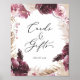 Denna boho-pampasgräs-kort och -gåvoskylt är perfekt för en sommarbröllop eller brudvisning. Den blomsterinspirerade akvarelldesignen har bohemiska burgunderröda och rosafärgade blommor med kvistar av neutralt pampasgräs och gyllene torkade palmlöven. Textraden längst ner på skylten kan anpassas med datumet, brudens och brudgummens namn eller ett kort meddelande som "Tack". Skylten kan användas för ett bröllop eller någon annan tillställning eller fest.