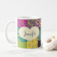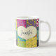 Det här söt mugg är redo att vara personlig med ett namn i skript eller kursiv stil och har en gräddhjärtformad grafik av färgad som ställs in mot en illustration i stil på en färgstark karossfläck. Hjärtat och namn finns på båda sidor om mugg.