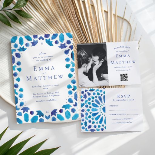 Transportera dina gäster till Medelhavets sol-kyssta stränder med vår pressade bröllopsinbjudan. De marockanska och spanska motiven, som är oerhört designade i pulserande blå nyanser, skapar en strålande elegans som är perfekt för ett målbröllop eller ett kusttemat firande. Teckensnittet för vattenfärgen och skriptet för elegant ger en känsla av lugn och sofistikering till den här inbjudningssviten. Den här unika designen kommer att fånga dina gäster och lämna dem att ivrigt föregripa din speciella dag.