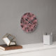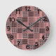 Den här väggklockan har en Boho-design av fyrkanter med mönster i svart och rosa.