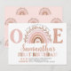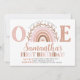 En roligt regnbåge första födelsedagsinbjudan med rosa och terracotta muterade toner som är perfekt för en boho-regnbåge som kallas party för din lilla födelsedag!