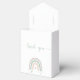 Kute boho babydusch med ett "tack" i ett vitt skript med snyggt med svash och en söt abstrakt vattenfärg av en grönt, orange och lavendelregnbåge med hjärtan. Anpassa med mor till namn och duschdatum.