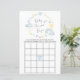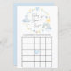 Cute whimsical baby bingo duschspel med blå och gult vattenfärger i regnbåge, sol, hjärtan, stjärnor, måne och moln och "Baby Shower Bingo" i ett snyggt-skript.