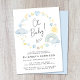 Boho pojke sprinkle-inbjudan som innehåller blått och gult vattenfärger från regnbåge, sol, hjärtan, stjärnor, måne och moln, "Oh Baby!" i ett snyggt-skript och mor till:s namn och duschdetaljer i enkel typografi.