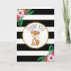 Ett babyduschkort som visar en illustration av en räv från baby som bär en blomma krona över en svart och vit strimlad bakgrund med blommigtens utformning överst till lämnat och grund höger. Matchande inbjudningar till babydusch vid koordinering finns på Jill's Paperie.