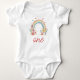 Fira din lilla en ettårsdag med stil med denna boho-pastell "Ett" design! Med en mjuk regnbåge, ömtåliga blommor och hjärtaccent, är denna söta bodysuit eller t-shirt perfekt för milstolpe-foton, tårt-smash och födelsedagsfester. Ett sött och stilrent sätt att markera den speciella dagen!