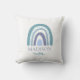 Kastkudden har en charmig och minimalistisk design. I mitten finns en halvcirkelformad regnbåge bestående av fem böjda band i nyanser av blå och turkos. Under regnbågen är det personliga namnet skrivet med en mjuk, kursiv stil i en matchande turkos färg. Till höger om namnet finns en liten kvist med blad i samma turkosa nyans, vilket ger designen en delikat touch. Det övergripande uttrycket är enkelt, modernt och personligt, med en lugn färgpalett.