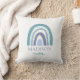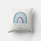 Kastkudden har en charmig och minimalistisk design. I mitten finns en halvcirkelformad regnbåge som består av fem böjda band i nyanser av blått och turkos. Under regnbågen är det personliga namnet skrivet med en mjuk, kursiv stil i en matchande turkos färg. Till höger om namnet finns en liten kvist med blad i samma turkosa nyans, som ger en delikat touch till designen. Det övergripande utseendet är enkelt, modernt och personligt, med en lugn färgpalett.
