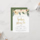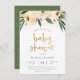 Den här bohemiska inbjudan innehåller "babydusch" i ett plock av faux guld-skript, inramat av konetti, tre rosa- och vattenfärgsblad. Din information visas under i en elegant. Korten går tillbaka till en vacker skugga av grönt med ett enkelt vitt mönster. Den här designen är underbar för utomhusevenemang eller för tematiska duschar i blommigten.