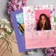Med mörk lavender lila "Student"-skripttext och ditt student-foto kommer denna unika studenten-annonseringsdesign säkerligen att imponera. Vackra blommigtar för vildblommor är täckta över en vattenfärgsbakgrund för rosa av övertoning som bakgrund för graderingens foto på framsidan. Utrymme nedanför student namn, klass och skola i mörk Lavender lila text. Baksidan har ett annat foto på en solid, djup lavender-bakgrund med blekens rosa för information och planer för din överordnade.