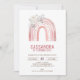 En inbjudan till boho-regnbågsfödelsedag, försedd med vit ros, för att fira milstolpen för din lilla!