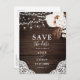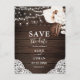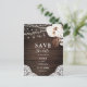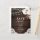 Boho chic bröllop spara datum vycard har neutralt blommor med torkad handflatan löv och ljus på trädekorerat trä.