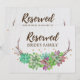 Denna boho-rustika blommiga suckulentbröllop "reserverad"-skylt är perfekt för ett rustikt land eller ökenbröllop. Designen är dubbelsidig (tryck på båda sidor) och har vackra färgglada gröna, rosa och lila suckulenter arrangerade på en grenkrans och accentuerade med falskt guldkonfetti. Använd dessa kort för att reservera stolar eller bord vid din bröllopsceremoni eller mottagning. Designad med omsorg av Miriam på Fresh & Yummy Paperie. För koordinerade föremål, besök min Zazzle-butik: