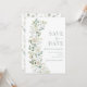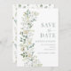 Indulge i sofistikering med vår förfinade rustik Spara datuminbjudningarna, med en delikat viskartad andedräkt av sage grönt löv som är sammanflätad med vita blommor och eukalyptus löv. Öka föregripandet för bröllop med denna unika inbjudan.